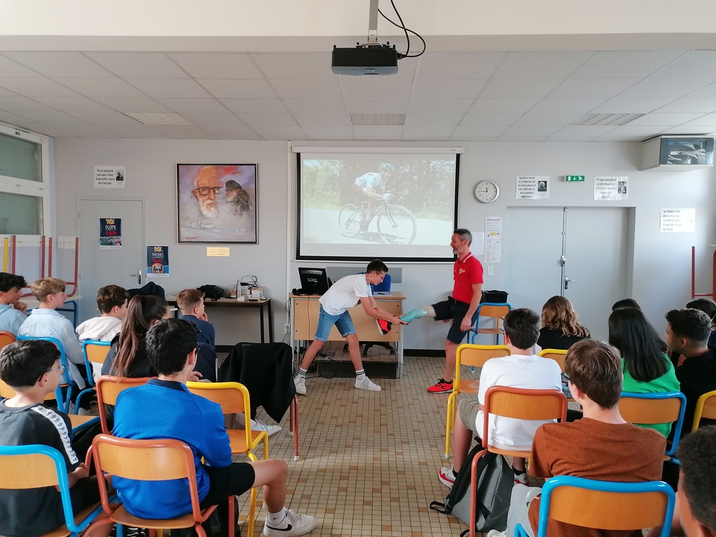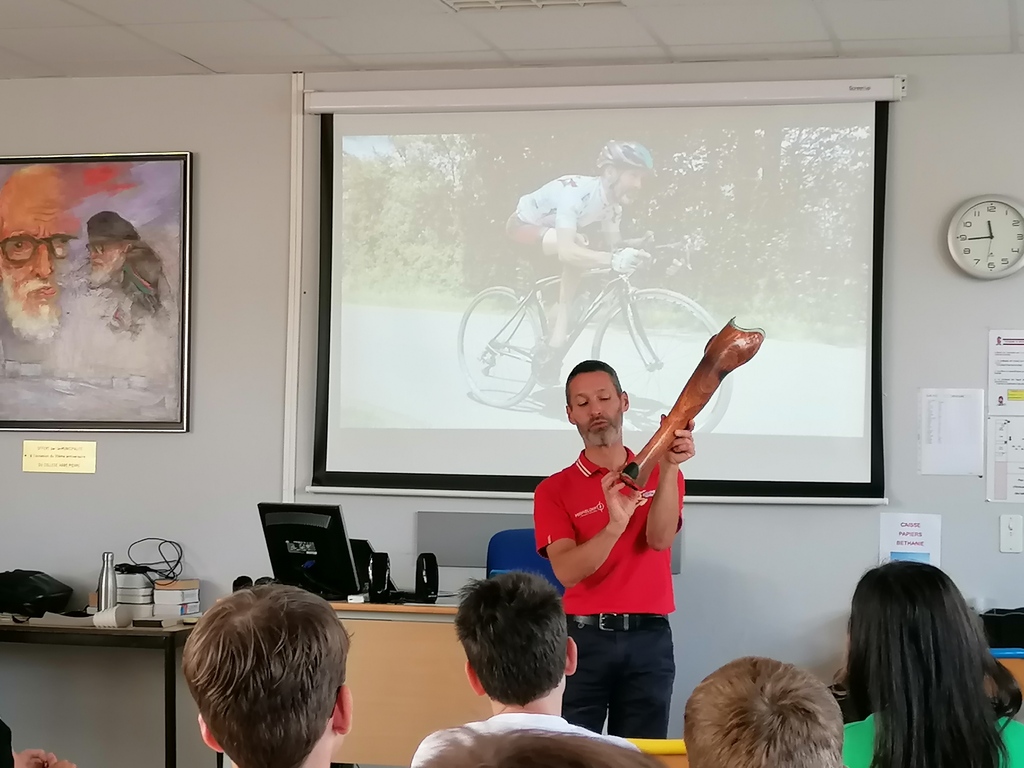 Mais la journée a surtout été marquée par la venue de Sébastien Bichon, amputé tibial à l'âge de 4 ans et médaillé de bronze en paracyclisme aux Jeux de Sydney (2000), qui multiplie aujourd'hui les aventures à vélo et à pied. Il a à coeur de transmettre de belles valeurs aux jeunes, dont voici ici quelques extraits :