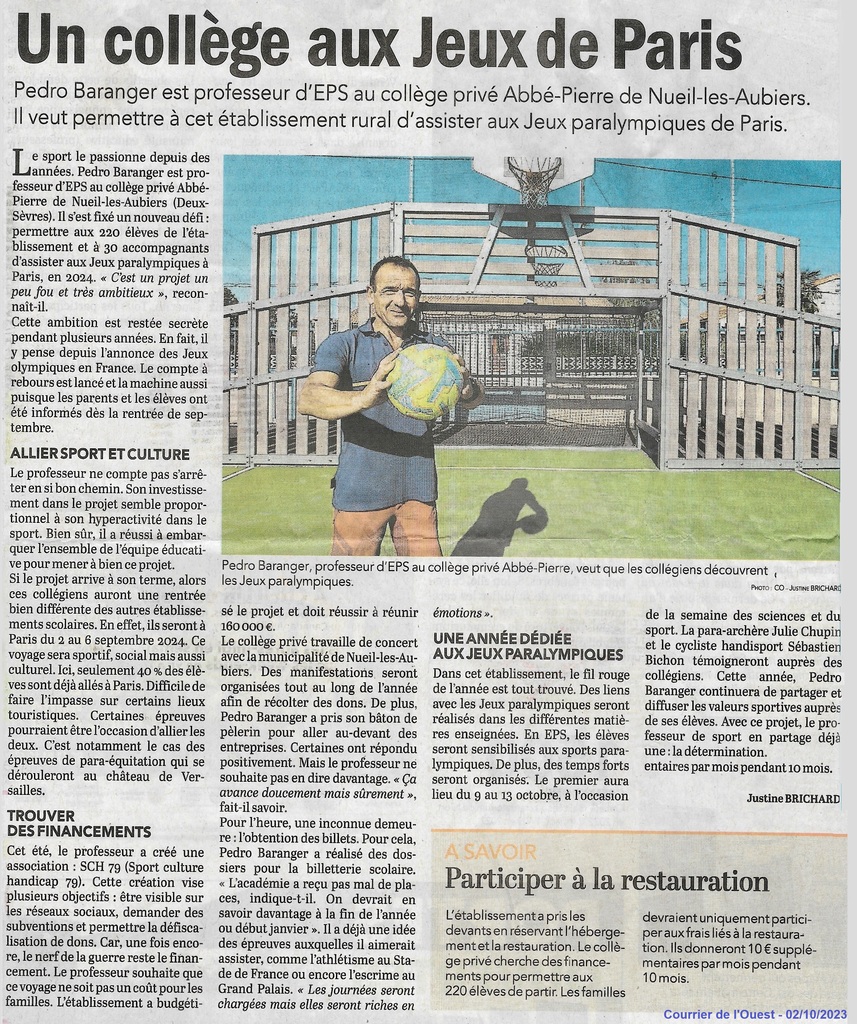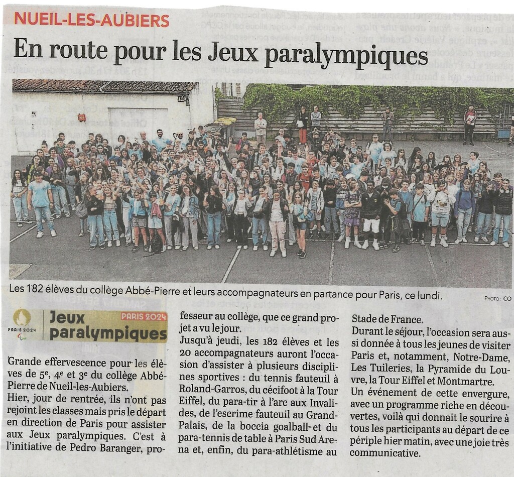 Le Collège Abbé Pierre se prépare à la Semaine Olympique et Paralympique qui se déroulera du 2 au 5 Avril 2024.Cette semaine est organisée en partenariat avec la Ville de Nueil les Aubiers.Mardi matin, ...